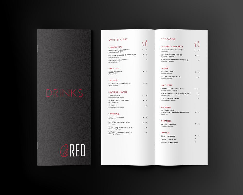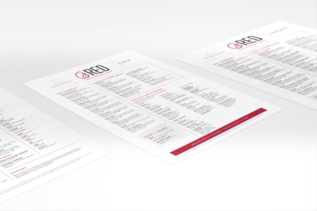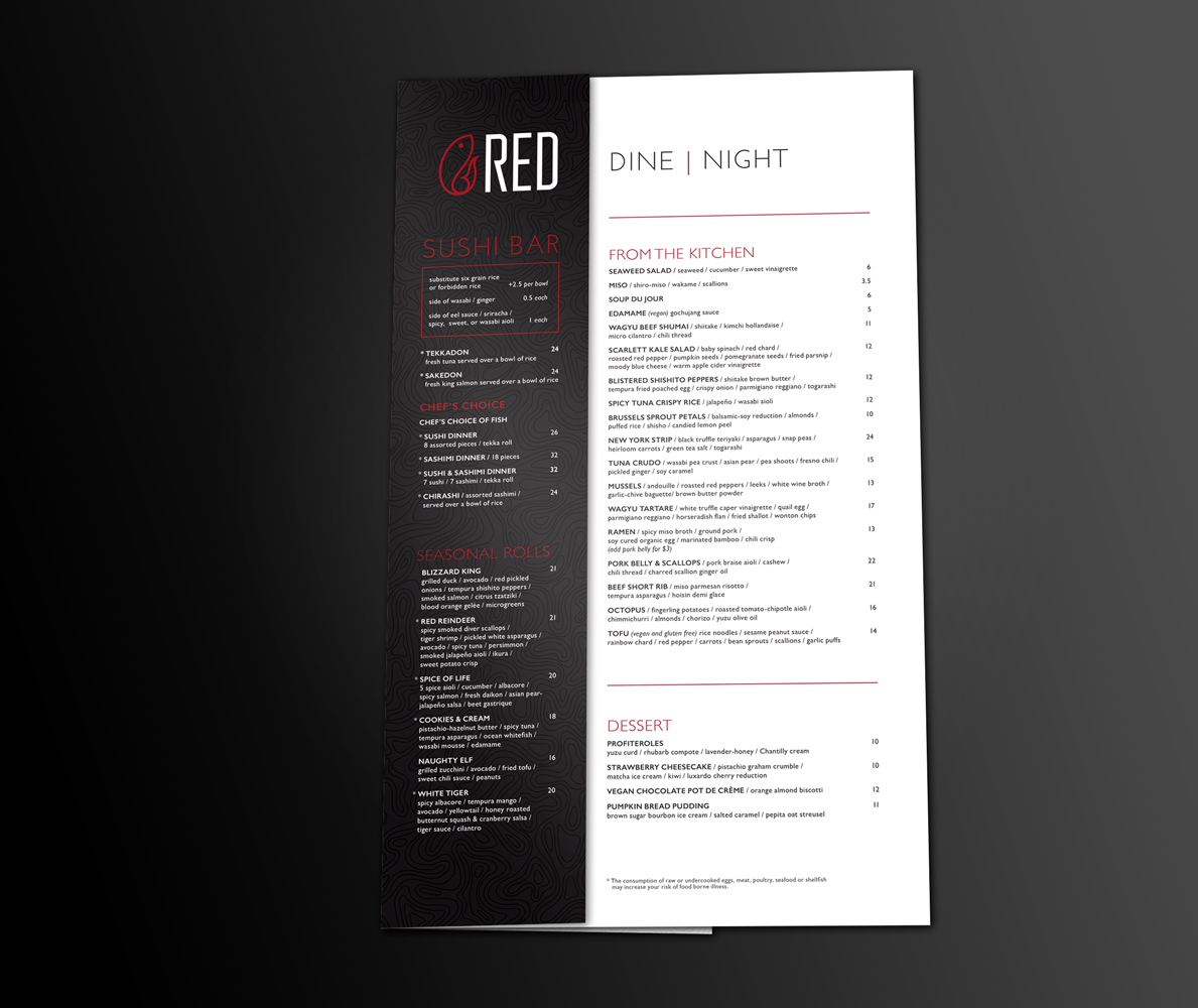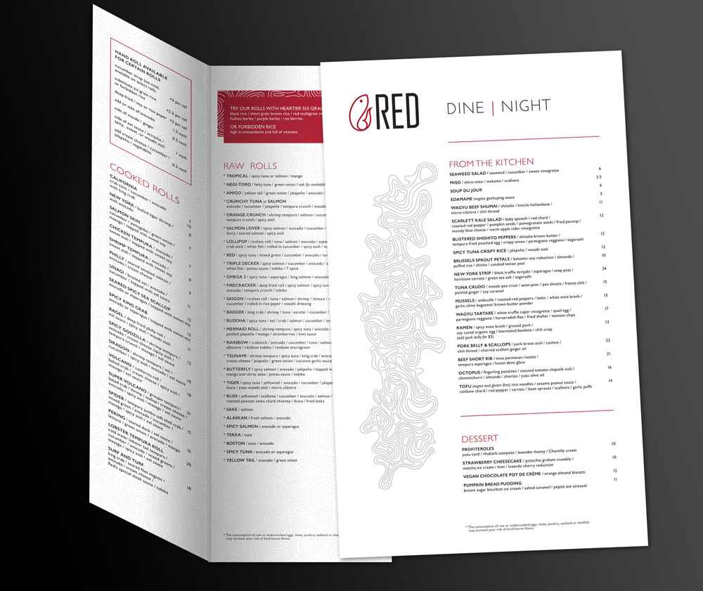 RED is a glamorous downtown restaurant, known for their fresh and inventive sushi creations. I worked with RED to create a memorable logo, restaurant signage, website, menus, brochures, ads, and more.